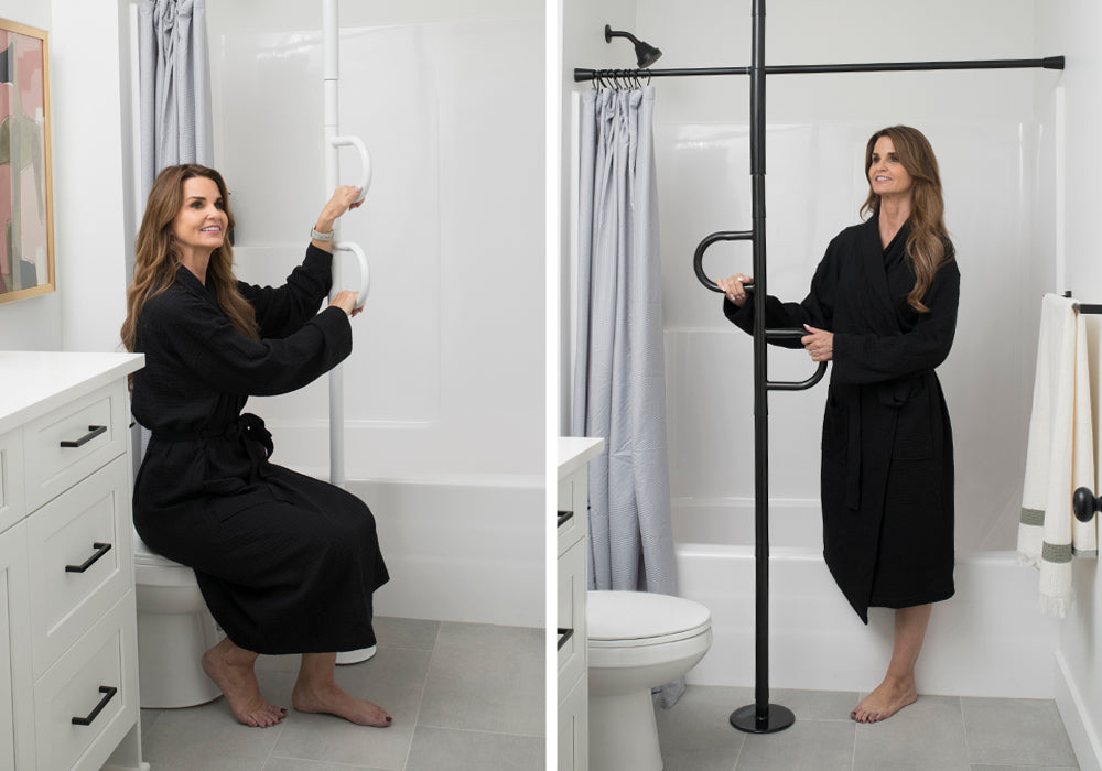 The transfer pole can be installed anywhere that poses a fall risk. The double handles provides leverage and support to sit, stand, or balance without caregiver assistance.