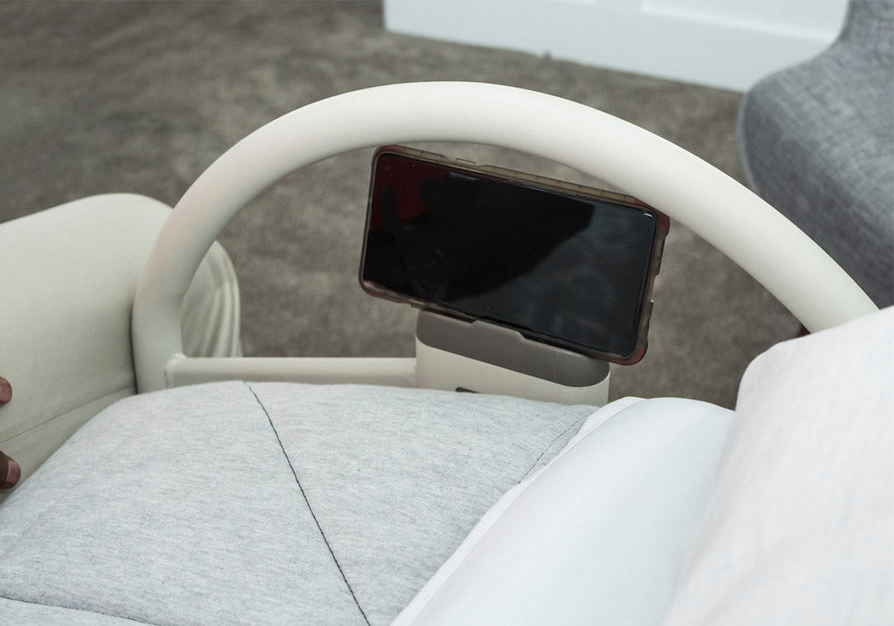 Monte su teléfono inteligente en el soporte incorporado para mantenerlo accesible o para ver programas fácilmente mientras está en la cama.