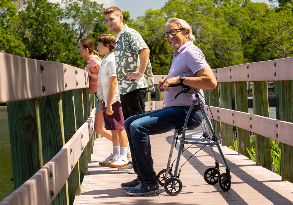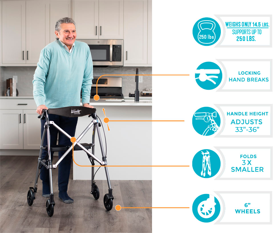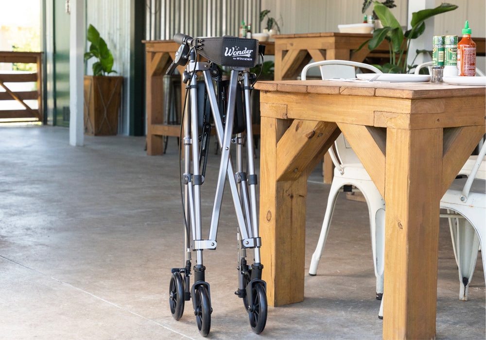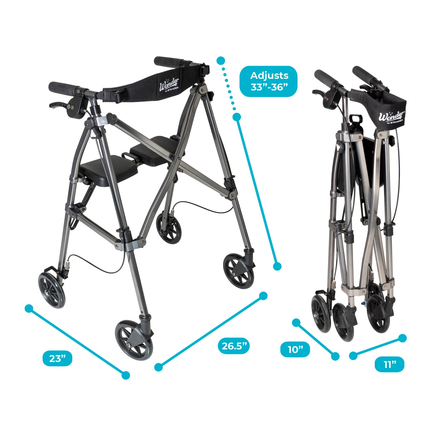 The compact rollator collapses to fit in the front seat of car or on an airplane