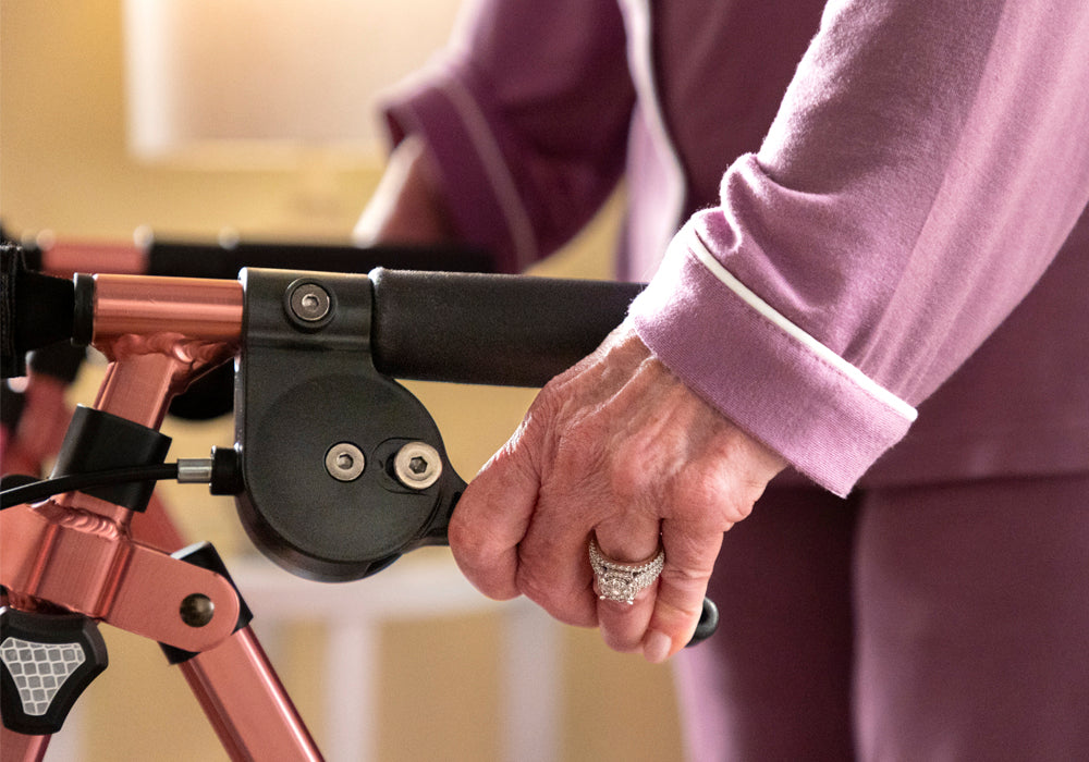 El andador compacto se pliega para caber en el asiento delantero del automóvil o en un avión.