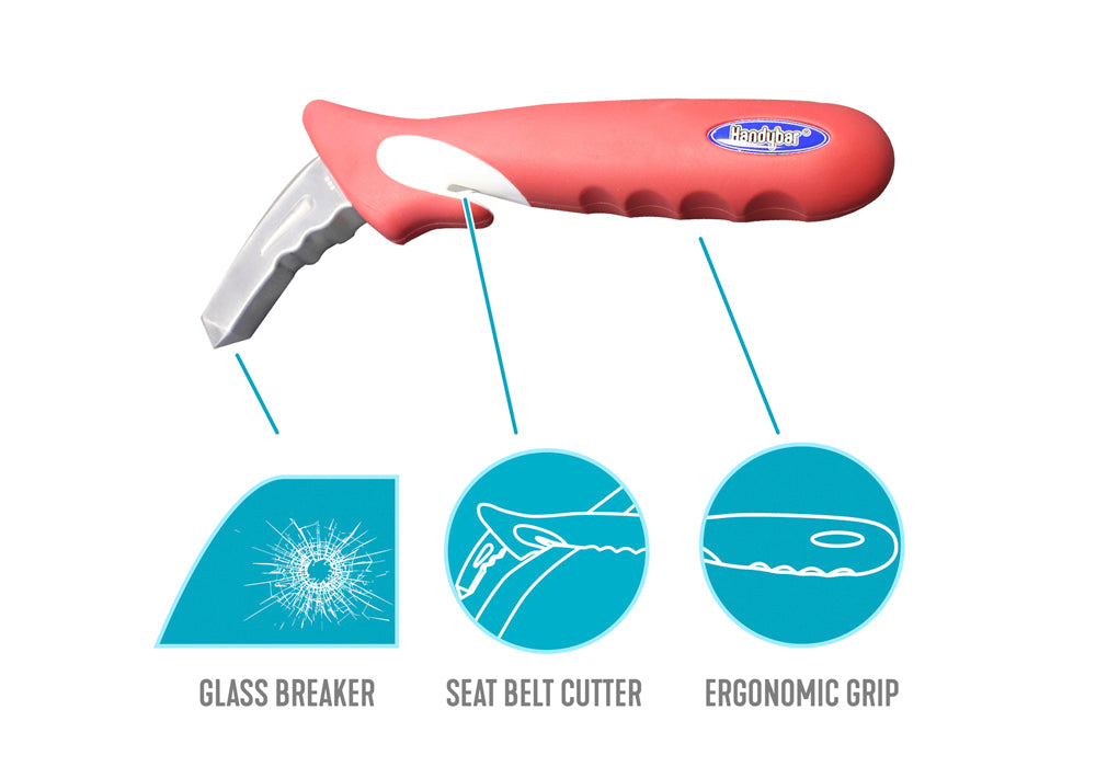 The HandyBar includes built-in safety features like a seat belt cutter and window breaker