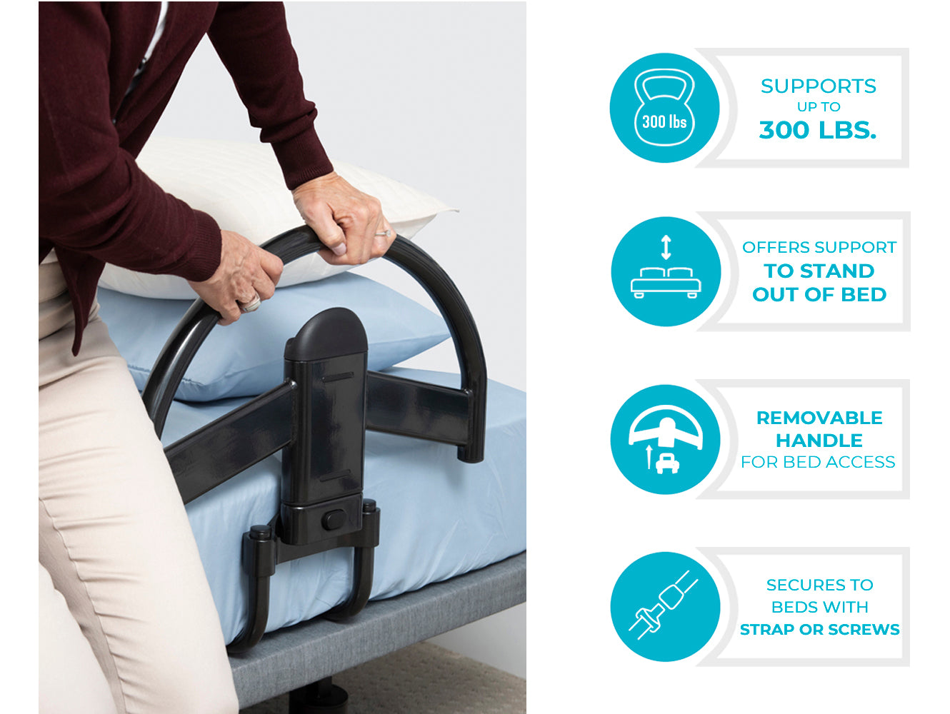Handle secures to most any bed with safety strap or screws