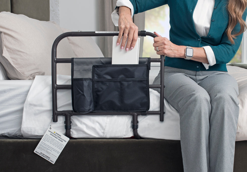 The multi-pocket organizer pouch keeps handy items accessible at your bedside