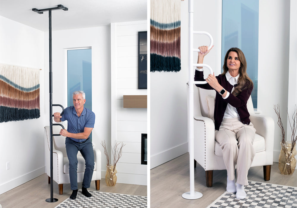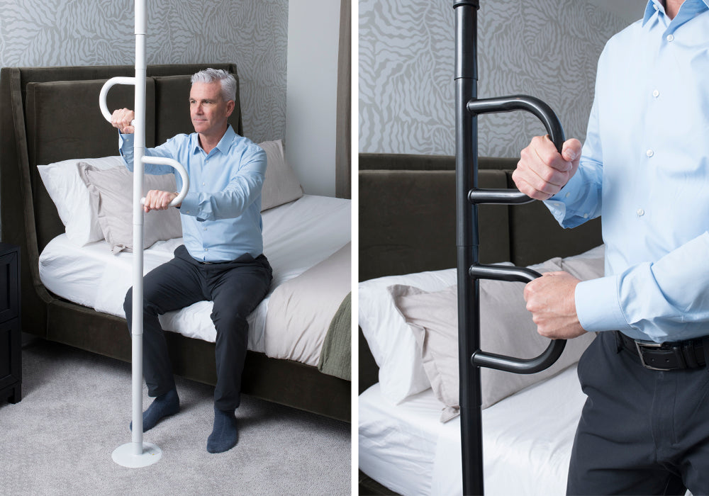 The transfer pole can be installed anywhere that poses a fall risk. The double handles provides leverage and support to sit, stand, or balance without caregiver assistance.