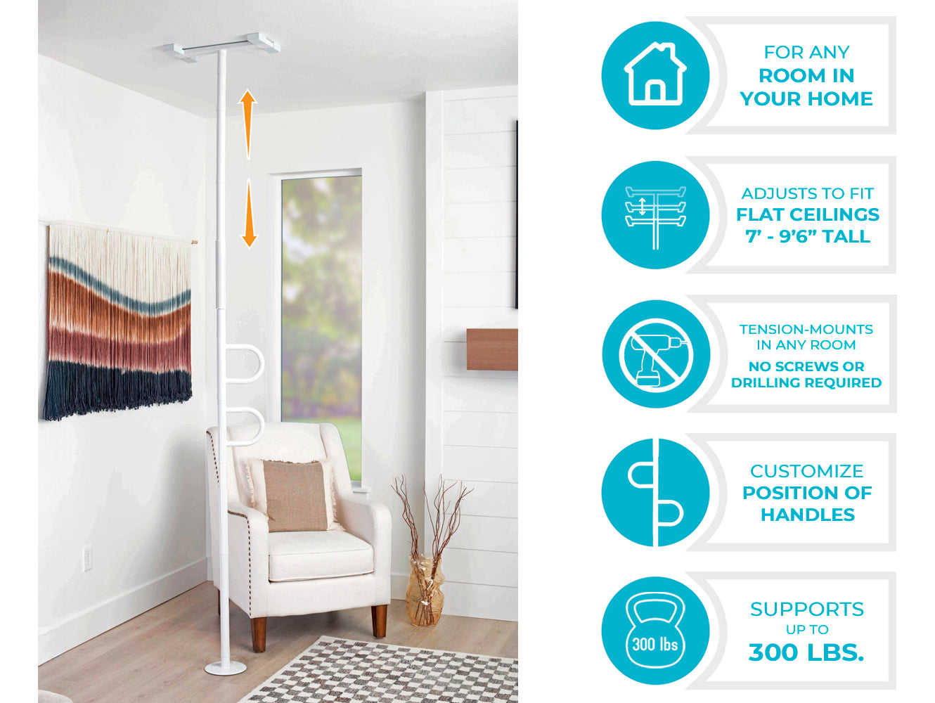 The Floor to Ceiling Grab Bar installs using tension between the floor and ceiling, no drilling required. For additional security, hardware is included to hard-mount the pole to the floor and ceiling if desired, but is not required.