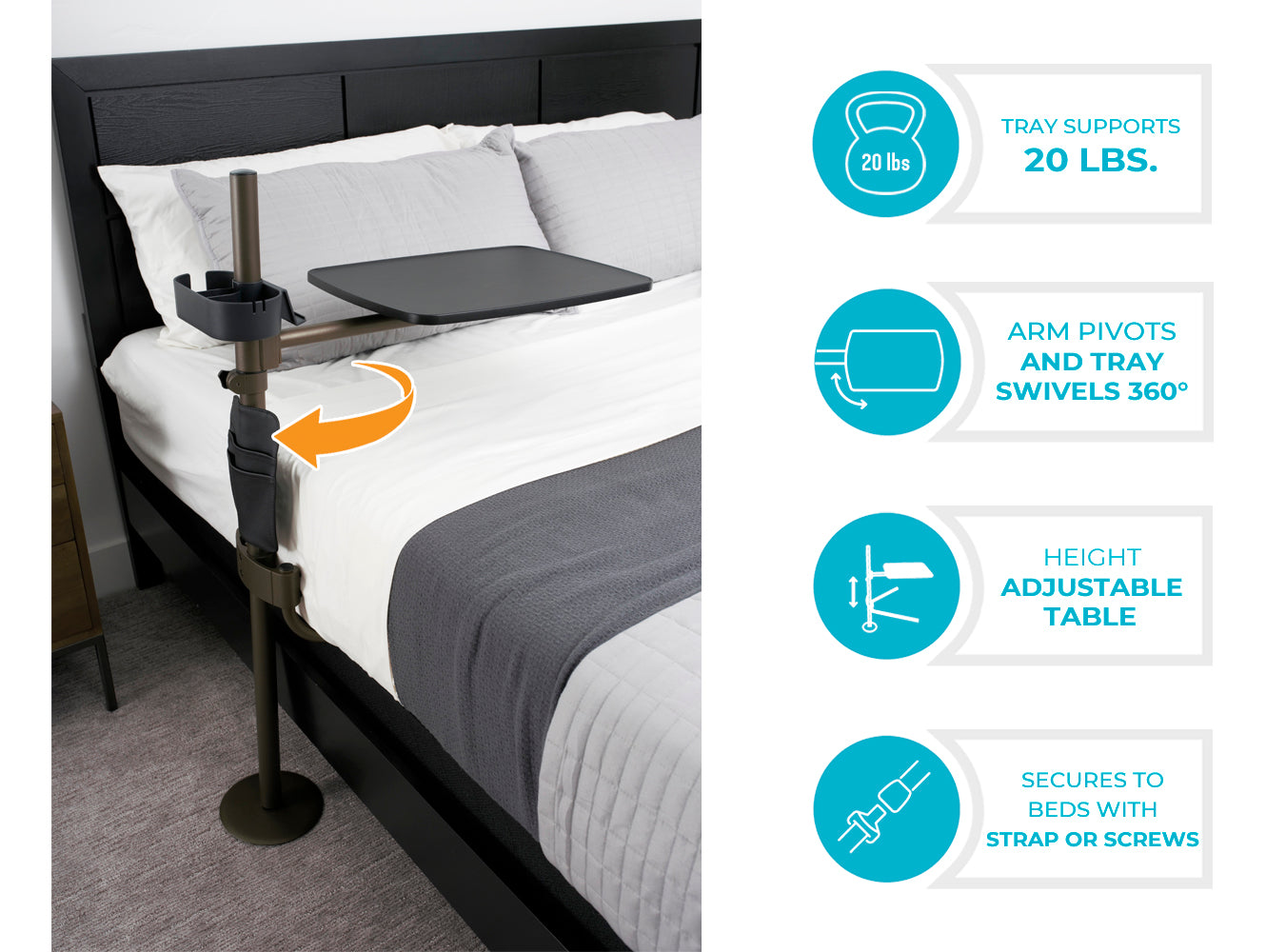 The black tray pivots and rotates 360 degrees to be used while in bed or as a side table