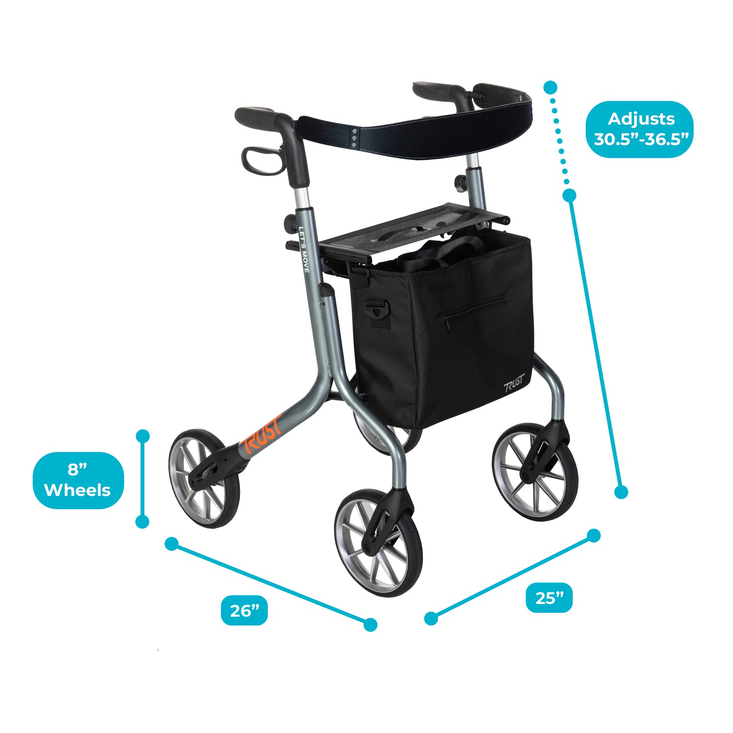 The Let’s Move easily folds in half and locks to keep the rollator from unraveling when being transported.