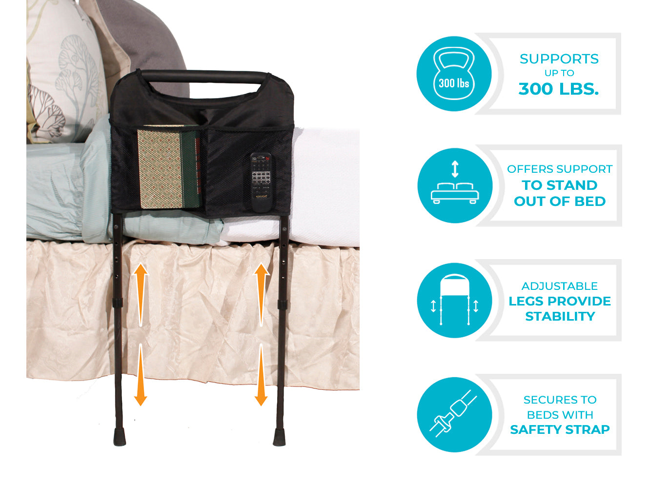 Attaches to bed frame with safety strap