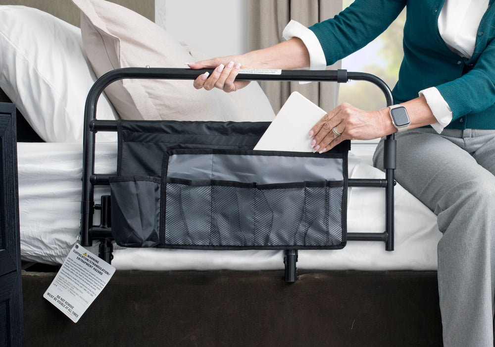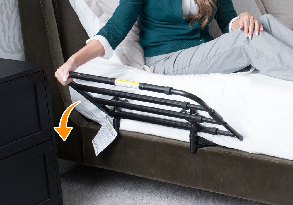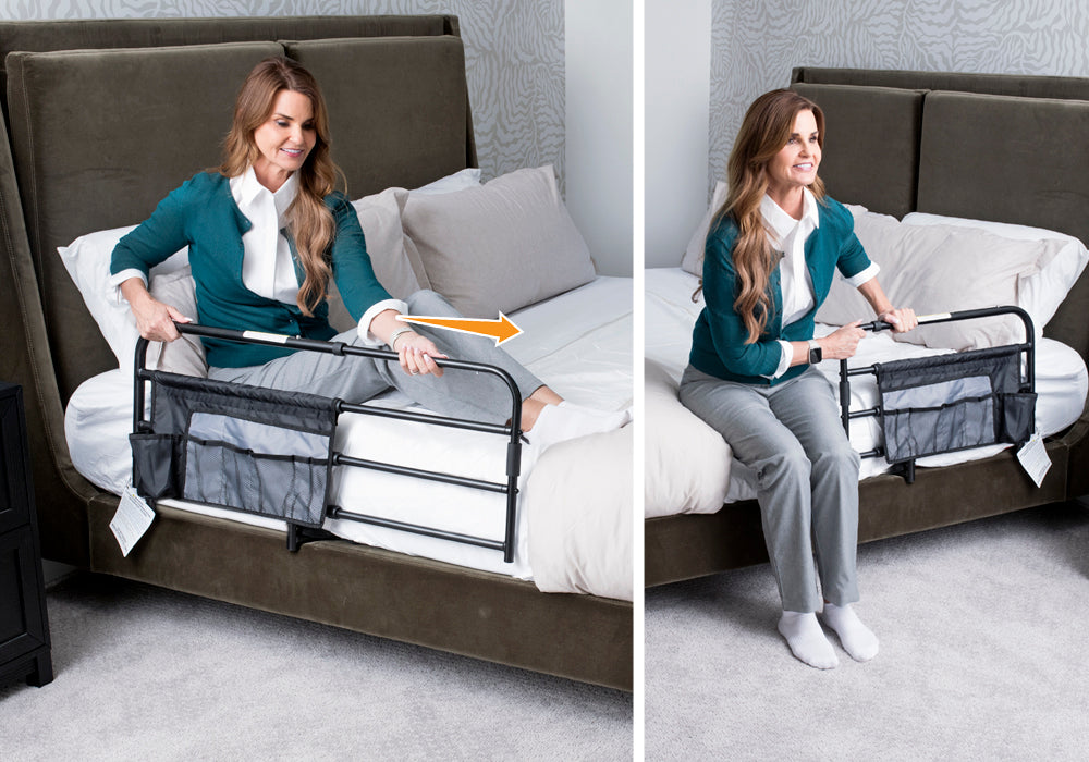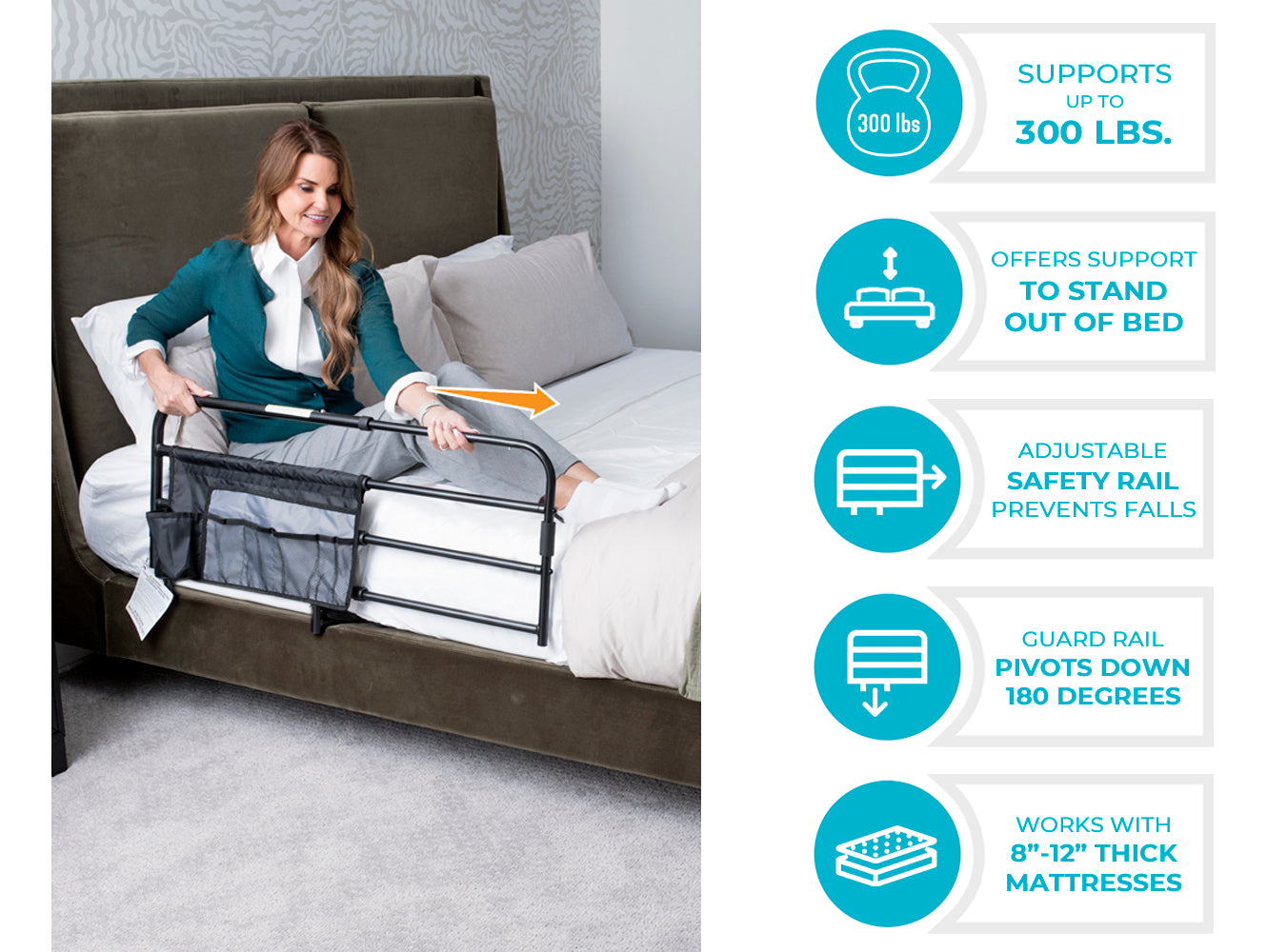 The safety railing extends in length for protection at night and doubles as support handle to get out of bed