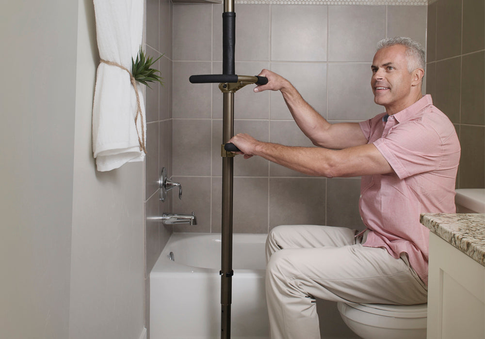 Place between the shower and toilet to prevent falls from both