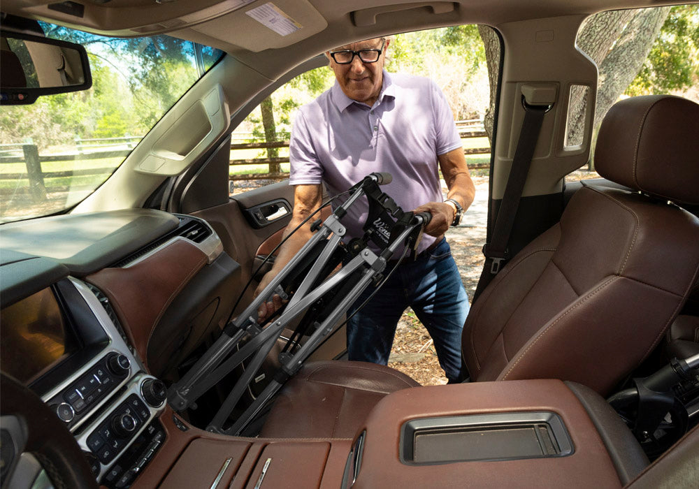 The compact rollator collapses to fit in the front seat of car or on an airplane