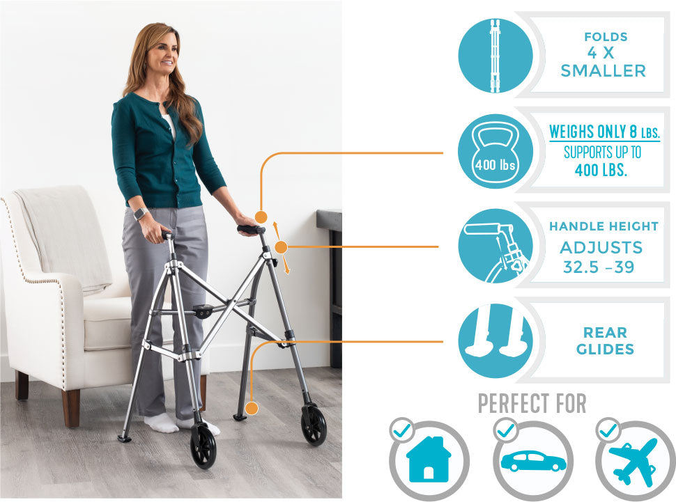 The compact walker collapses to fit in the front seat of car or on an airplane